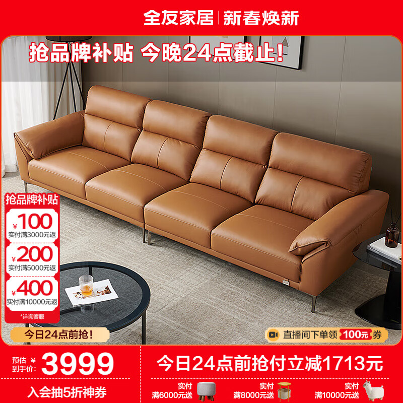 全友家居 现代简约头层牛皮直排大象耳朵大户型真皮艺沙发客厅112021价格:5712.86元!