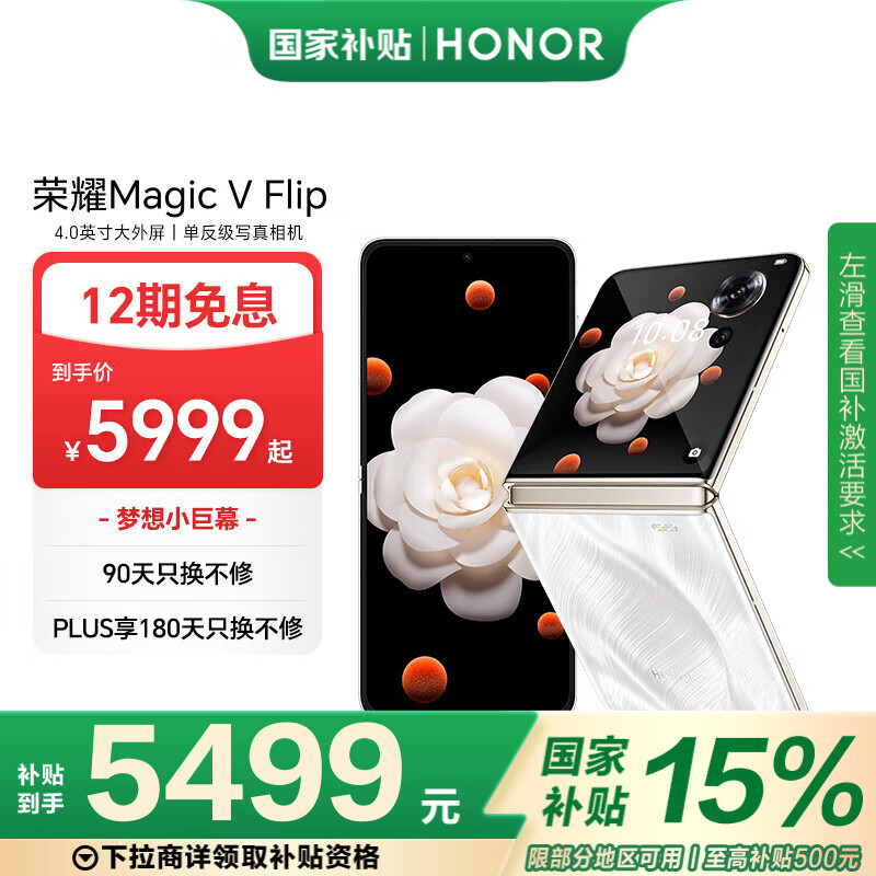 荣耀Magic V Flip 新款小折叠屏 4.0英寸大外屏 单反级写真相机 12+1TB 山茶白 5G AI手机 政府补贴价格:5999.00元!