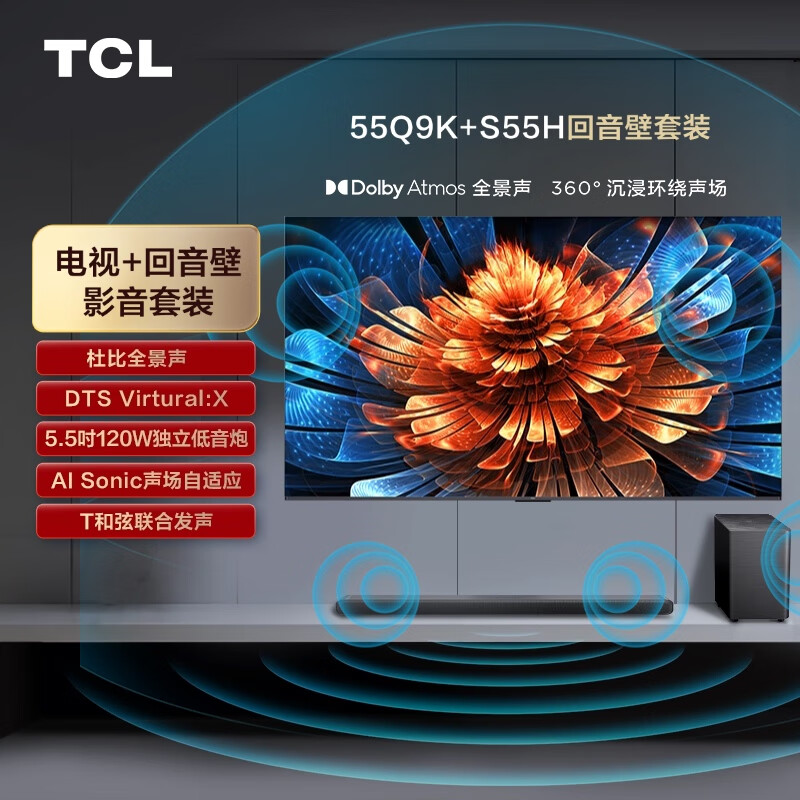 TCL音响版本-55Q9K 55英寸 QD-Mini LED电视 Q9K+杜比全景声回音壁 S55H价格:4198.00元!