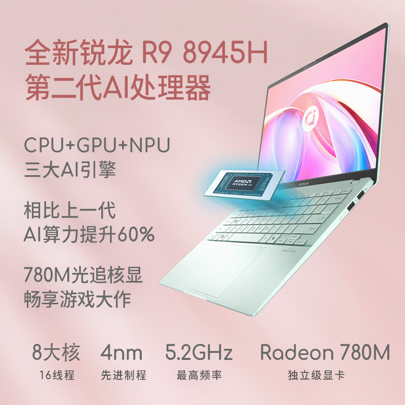 华硕a豆14 Air 补贴20% 高性能AI超轻薄笔记本电脑(R9 8945H 16G 1T 2.8K 120Hz OLED护眼屏) 青价格:5688.00元!