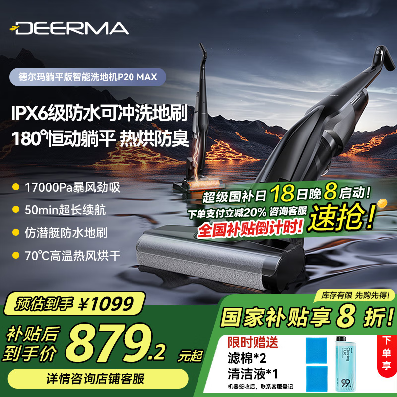 德尔玛(Deerma)无线洗地机P20Max 180度平躺 70℃热风烘干 IPX6级防水可冲洗地刷 防缠绕洗拖吸一体机吸尘器价格:1099.00元!