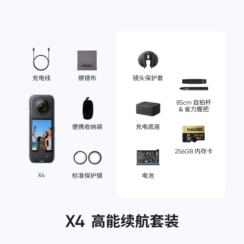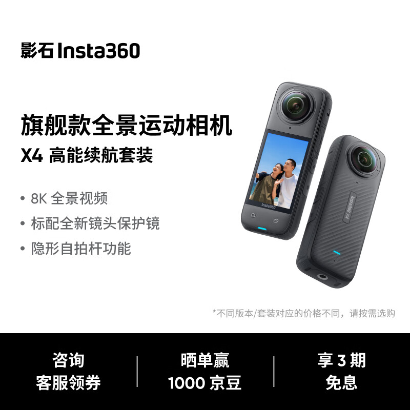 影石(Insta360)X4 全景运动相机8K高清防抖防水摄像机Vlog摩托车骑行滑雪潜水路亚(续航套装256G版)价格:4448.00元!