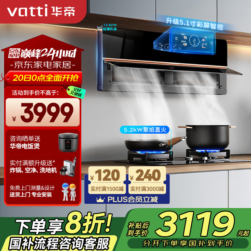 华帝(VATTI)抽油烟机 i111X6S超薄侧近吸家用变频大吸力26风量彩屏5.0KW燃气灶具套装X6pro天然气【套装商品】价格:3999.00元!