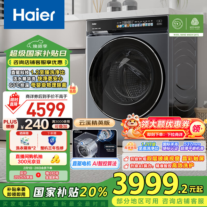 海尔(Haier)滚筒洗衣机全自动 云溪精英版 10公斤 XQG100-BLDE583HU1 家电补贴 以旧换新价格:4999.00元!