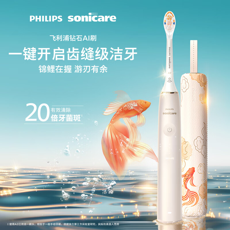 飞利浦(PHILIPS)钻石Ai电动牙刷 情侣款男女友 情人节礼物 充电旅行盒清除牙菌斑旗舰锦鲤款金色HX9997 补贴价格:2499.00元!