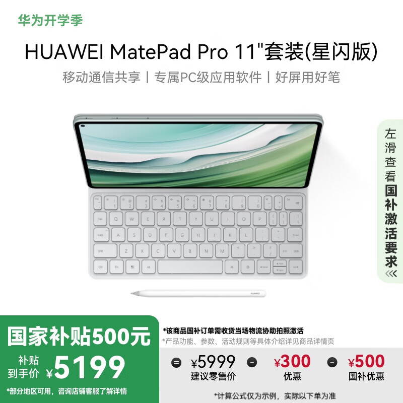 HUAWEI MatePad Pro 11英寸2024华为平板电脑办公学习星闪12+512GB WIFI雅川青 含星闪键盘+星闪笔价格:5699.00元!