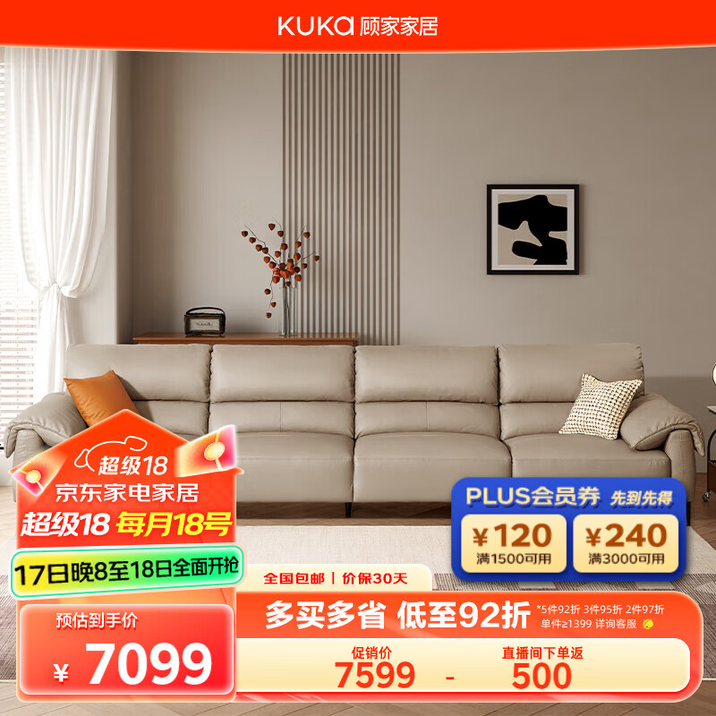 顾家家居(KUKA)【云端系列】现代头层牛皮沙发客厅垂耳扶手1253【燕麦色】四人位价格:7599.00元!