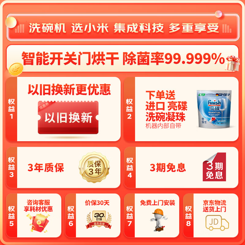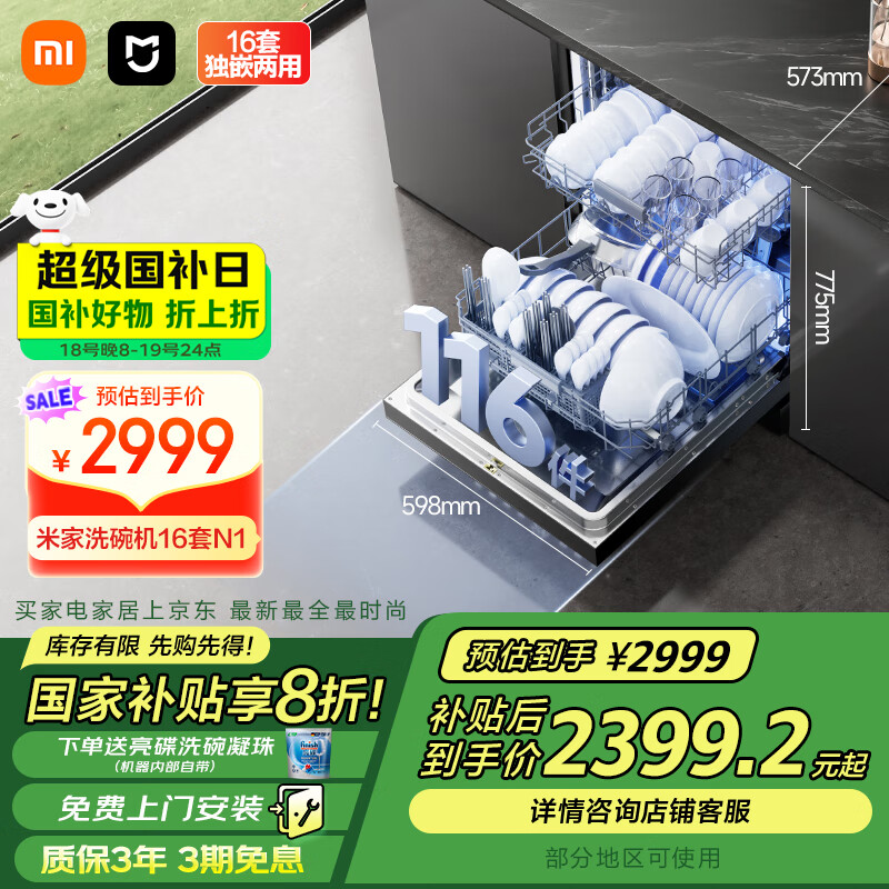 米家小米洗碗机16套N1大容量嵌入式独立式独嵌两用智能开关门热风烘干168H长效存储 一级水效QMDW1602M价格:2999.00元!