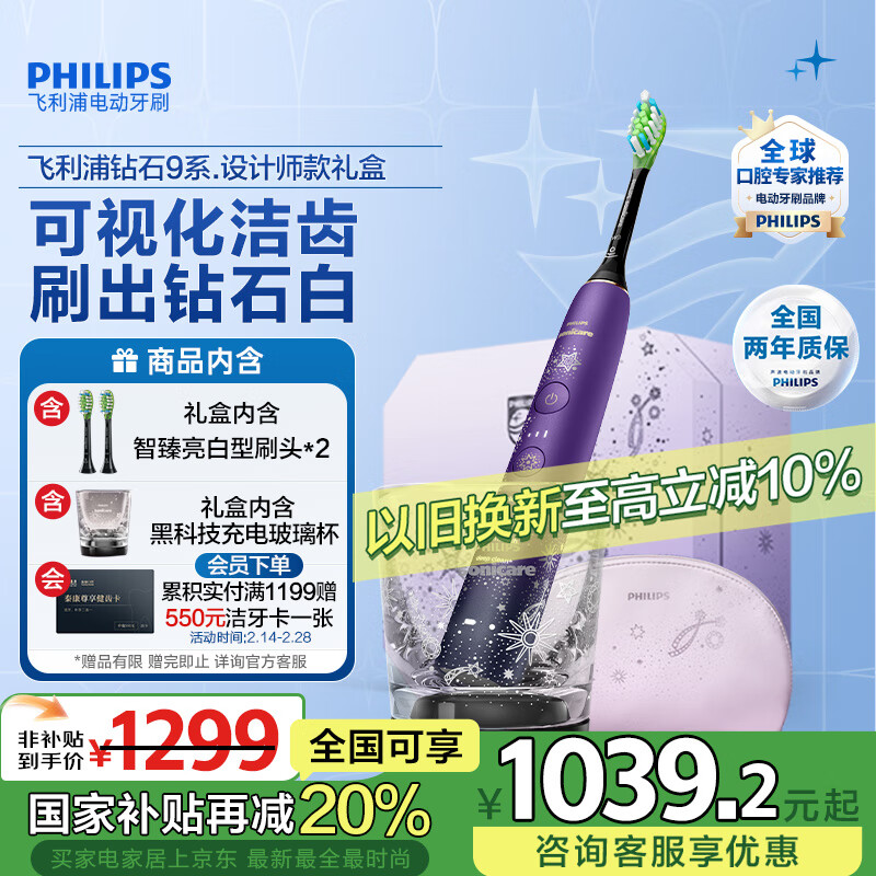 飞利浦(PHILIPS)电动牙刷成人 情侣款送男/女友 生日礼物 10倍清除牙菌斑1支刷头 钻石9系Pro礼盒 星辰紫 补贴价格:1299.00元!