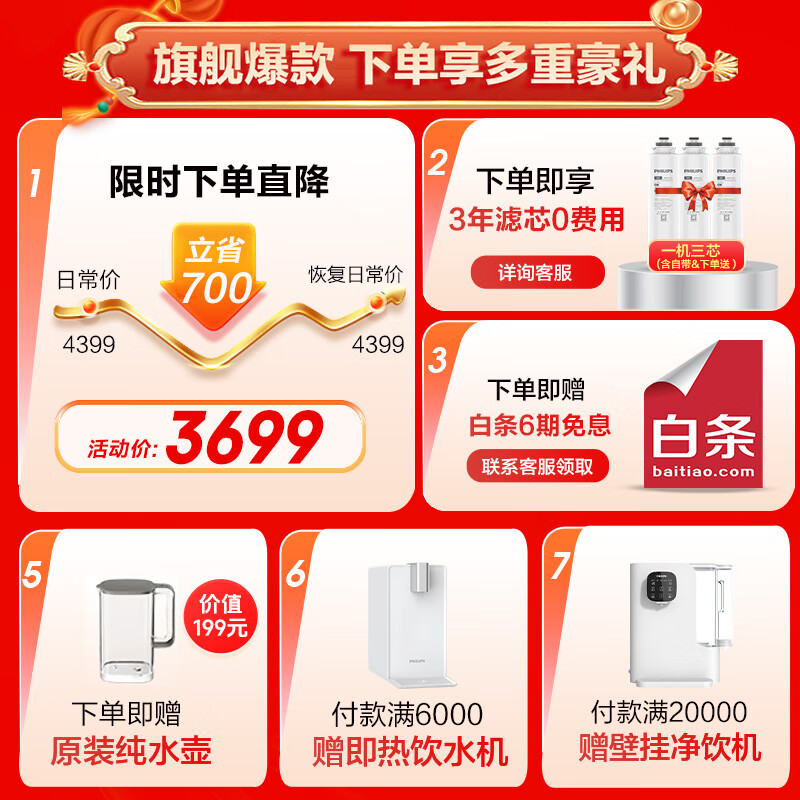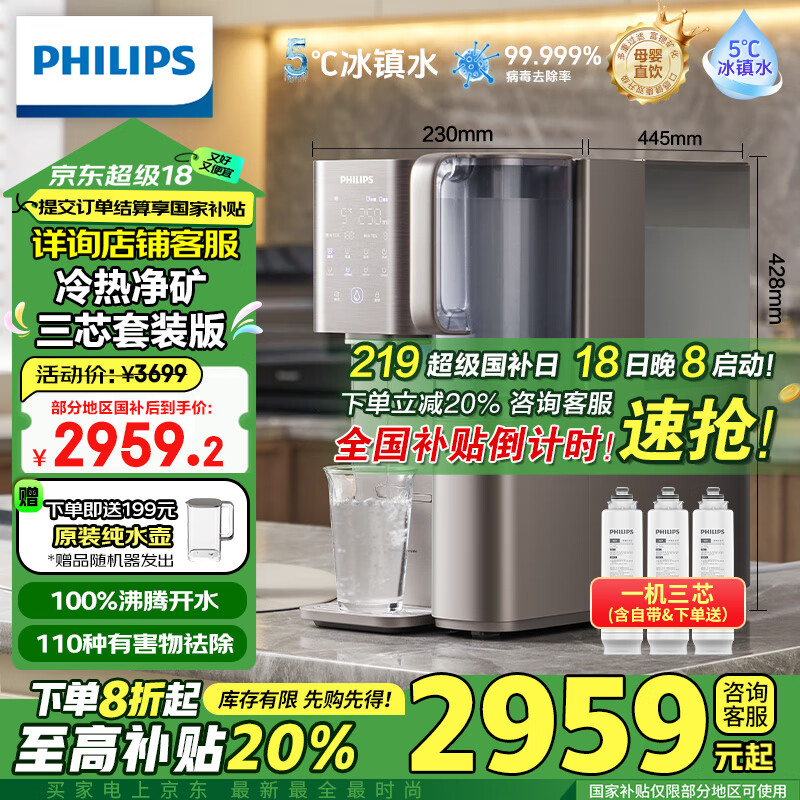 飞利浦(PHILIPS)净水器家用 冷热台式直饮机免安装净饮机饮水机冰水升级款ADD6876三芯版【补贴】价格:3699.00元!