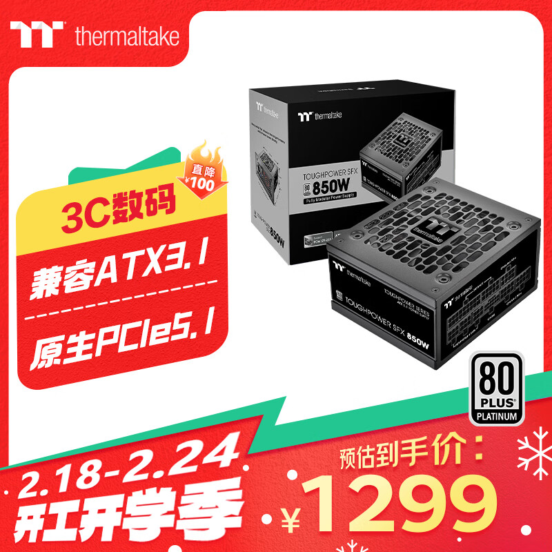 Thermaltake(Tt)额定850W 钢影Toughpower SFX 电脑电源(原生PCIe5.1/ATX3.1规范/80PLUS白金牌/全日系电容)价格:1299.00元!