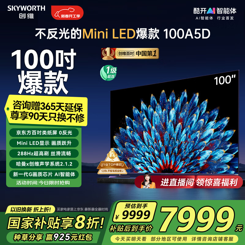 创维创维电视100A5D 100英寸miniled类纸屏 液晶平板游戏大屏电视机100吋 家电补贴以旧换新98英寸价格:9999.00元!