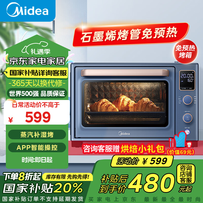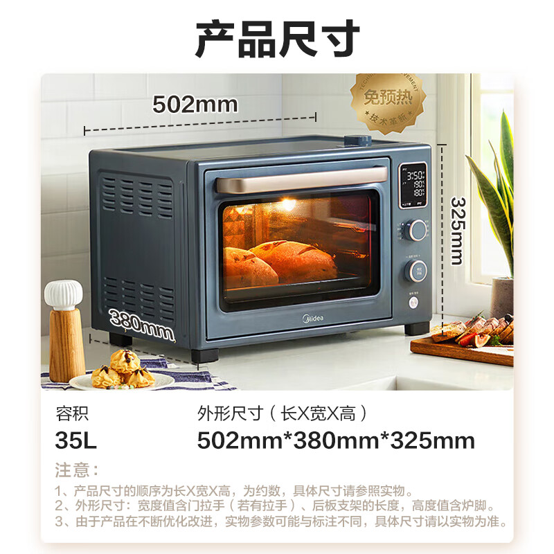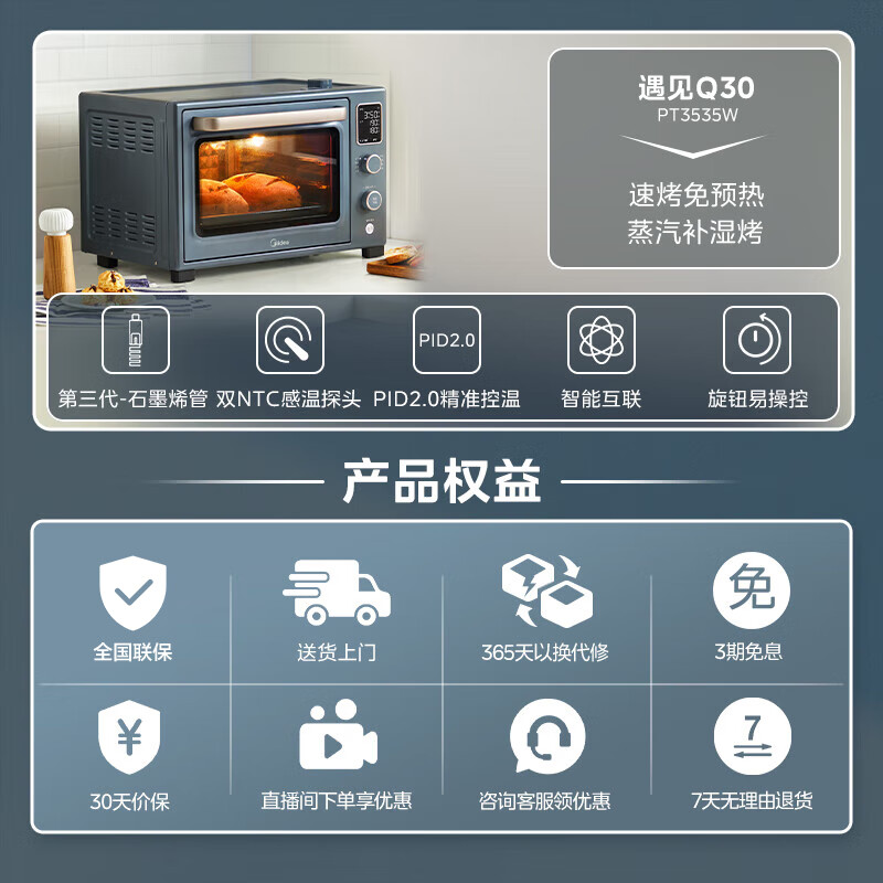 美的(Midea)【补贴】35L免预热家用电烤箱石墨烯烤箱Q30 搪瓷内胆/蒸汽补湿/精准控温/APP智控PT3535W价格:599.00元!