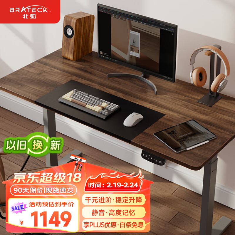 Brateck北弧电动升降电脑桌 站立办公升降电脑桌 工作升降台 K2棕1.5米价格:1999.00元!