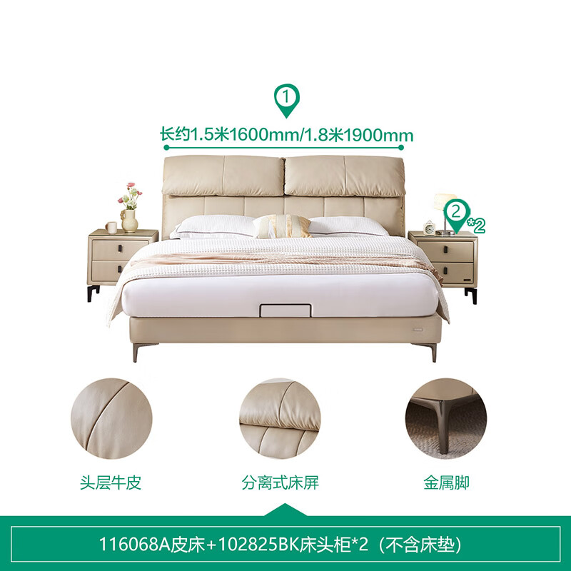 全友家居 现代简约真皮床1.5x2米卧室大象耳朵头层牛皮艺双人床116068价格:4284.29元!