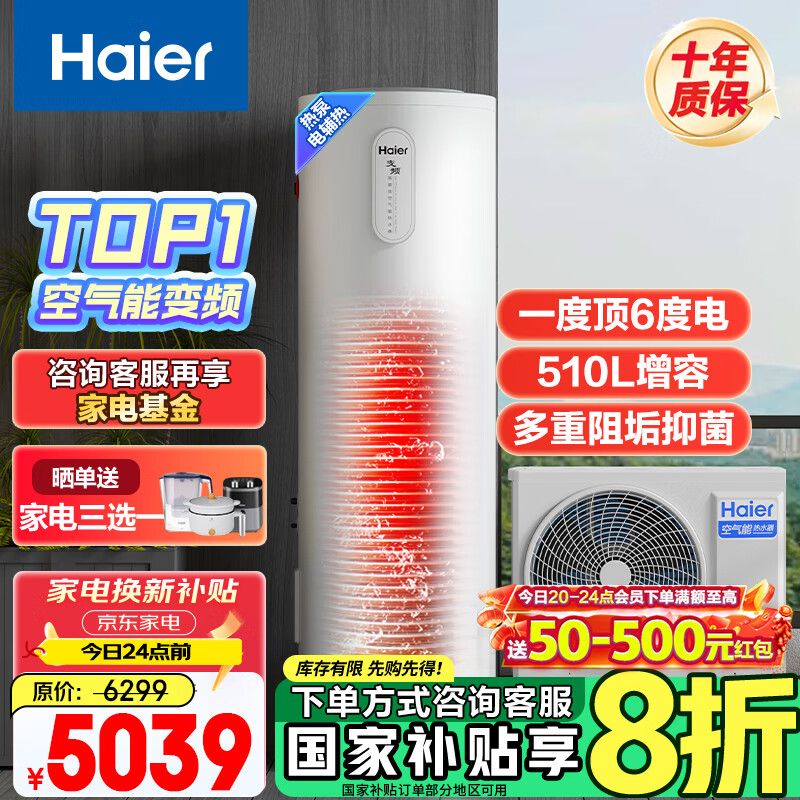 海尔(Haier)【小红花热水器-绽放版】空气能热水器200升热泵超一级全变频节能电辅80℃高水温FJE7(4-6人)价格:6299.00元!