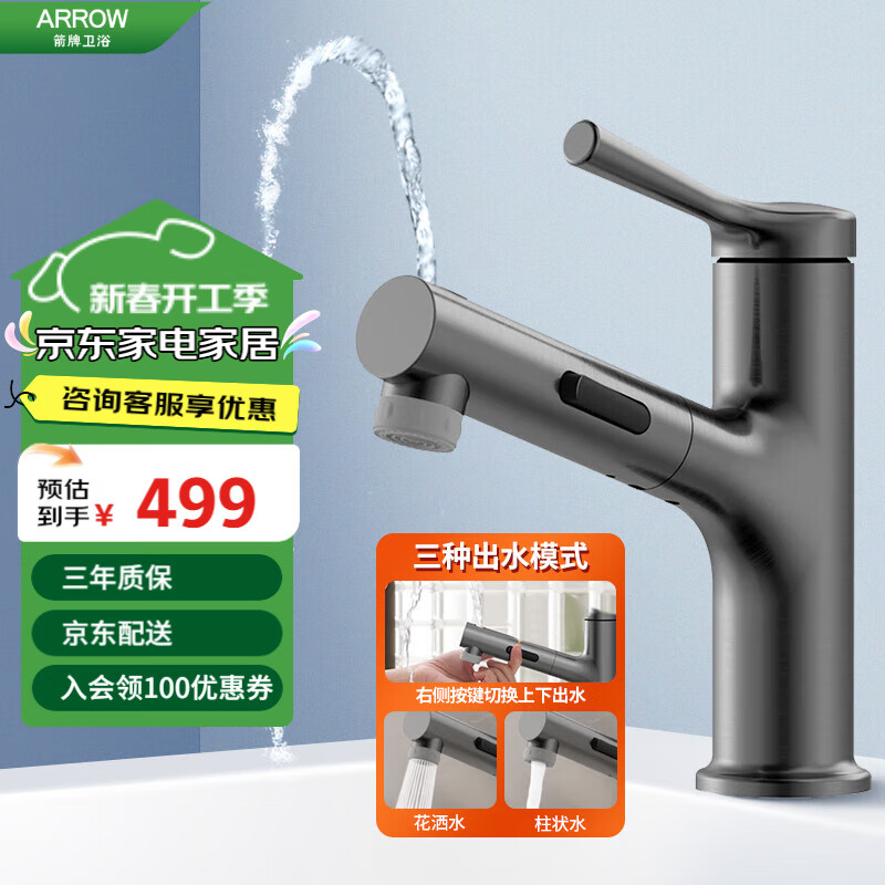 箭牌(ARROW)枪灰面盆水龙头冷热洗脸盆水龙头卫生间抽拉式水龙头AE4175MGG价格:499.00元!