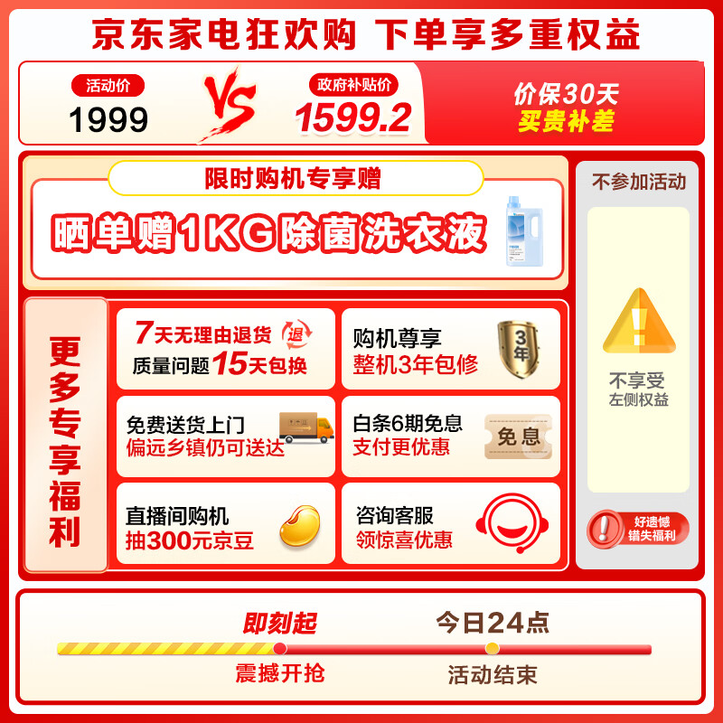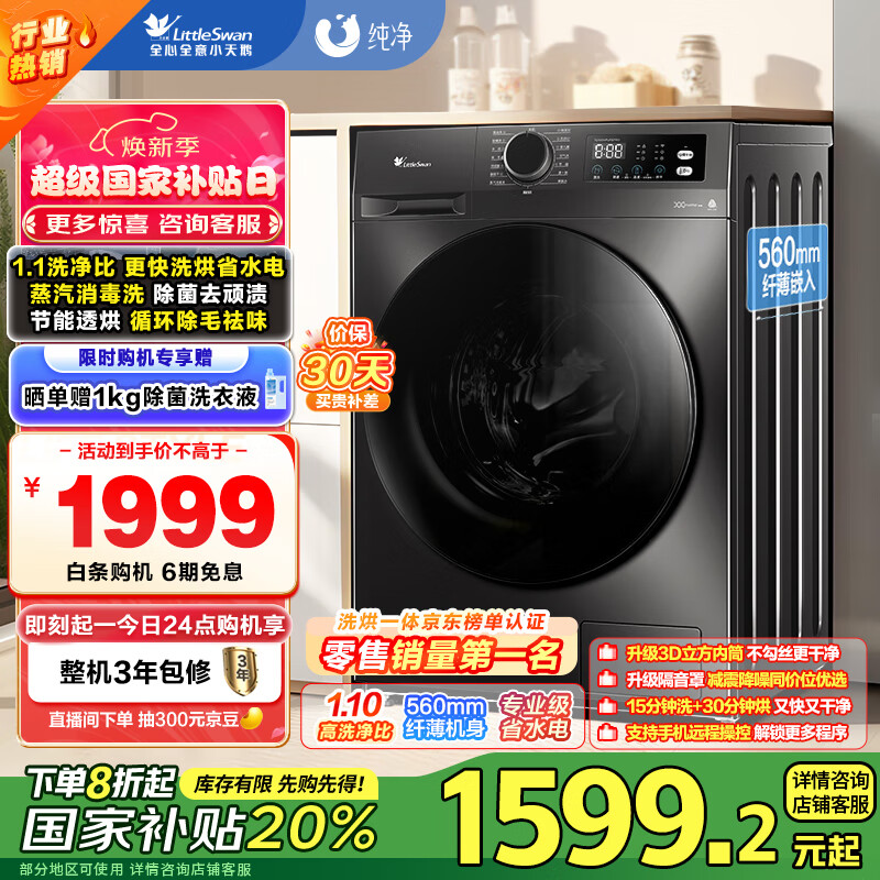 小天鹅(LittleSwan)滚筒洗衣机全自动家用 带烘干洗烘一体 TD100APUREPRO 10公斤 以旧换新 家电补贴20% 一级能效价格:1999.00元!