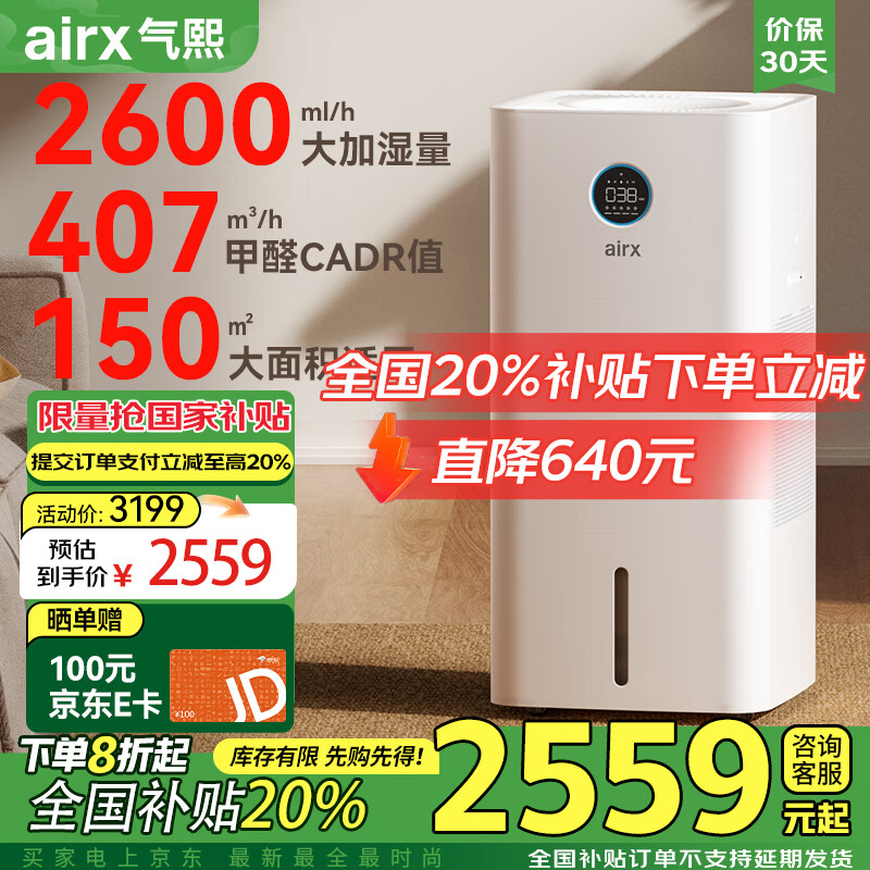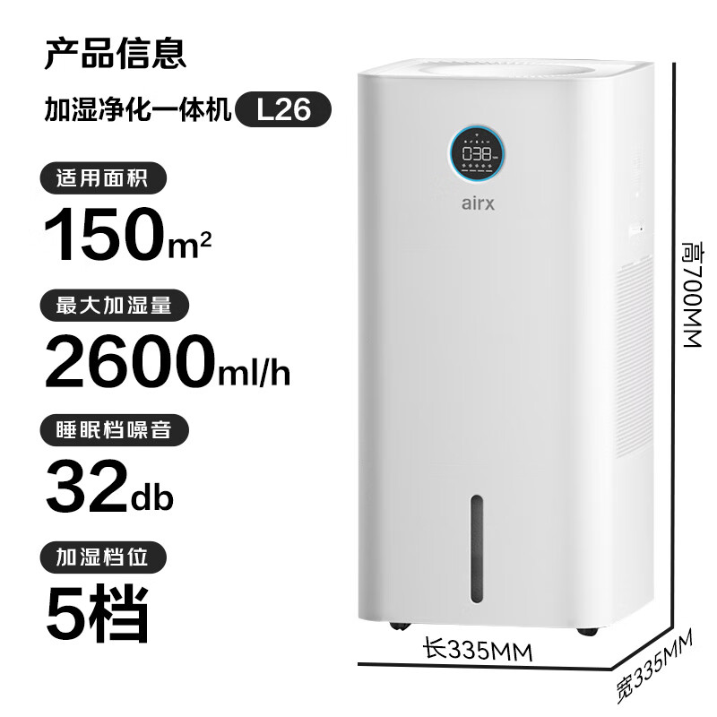 气熙(airx)加湿器空气净化器一体机无雾加湿母婴级除甲醛除细菌宠物毛发2600ml/h加湿量L26【家电补贴】价格:3199.00元!
