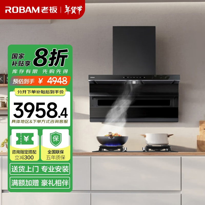 老板(Robam)油烟机家用顶侧双吸抽油烟机大吸力25风量一级能效侧顶吸油烟机家用燃气灶27A13-D1+57B8A天然气价格:4948.00元!