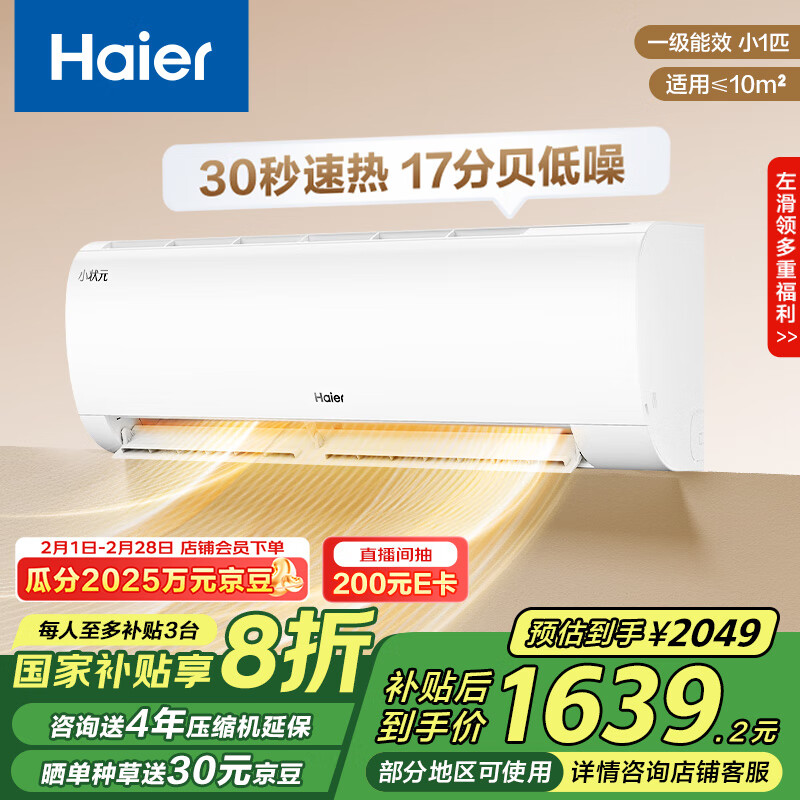 海尔(Haier)空调 小1匹 一级能效变频 冷暖节能挂机 卧室空调 KFR-22GW/01PAA81U1 补贴以旧换新价格:2049.00元!
