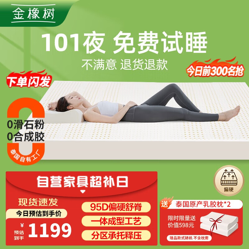 金橡树泰国进口天然乳胶原液双人床垫 1.5米x2米 泰舒95D 含内外套价格:1199.00元!