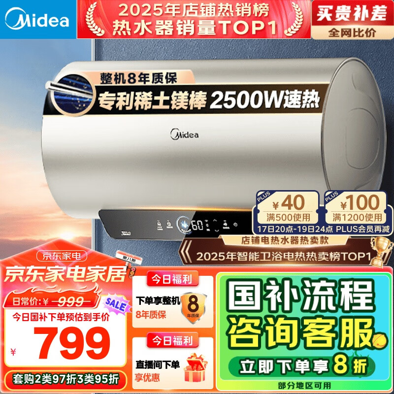 美的(Midea)以旧换新家电补贴终身免换镁棒60升2500W一级能效40倍耐用加热管家用电热水器F6025-JE4(HE)价格:999.00元!