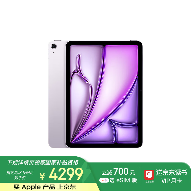 Apple/苹果 iPad Air 11英寸 M2芯片 2024年新款平板电脑(Air6/128G WLAN版/MUWF3CH/A)紫色价格:4799.00元!