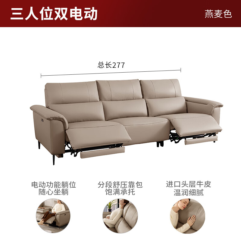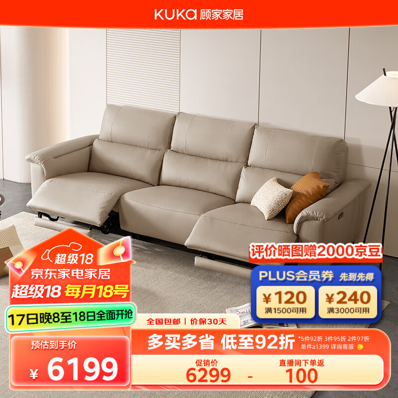 顾家家居(KUKA)零靠墙现代简约电动功能皮沙发客厅6196【燕麦色】三人位2电动价格:6299.00元!