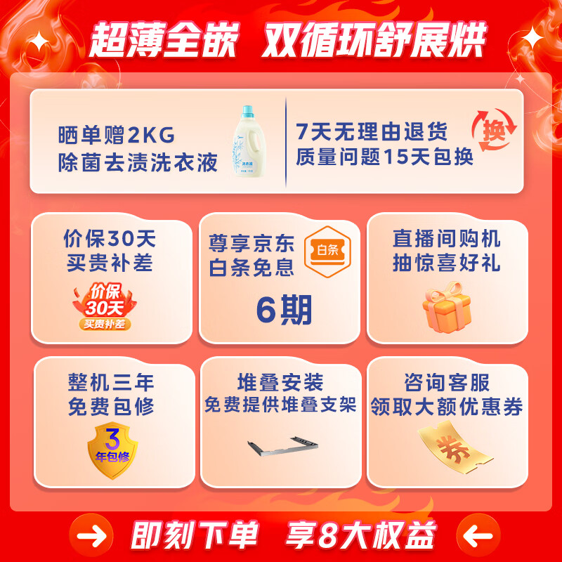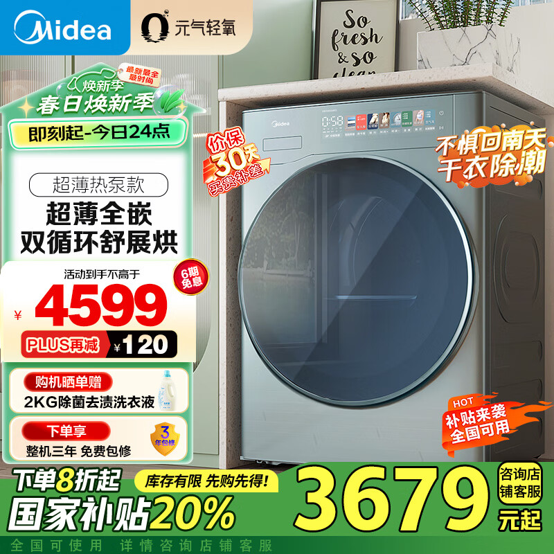 美的(Midea)10公斤热泵烘干机 干衣机家用 元气轻氧 超薄全嵌 分级除菌 毛屑净滤 MH100IAIR3价格:4553.00元!