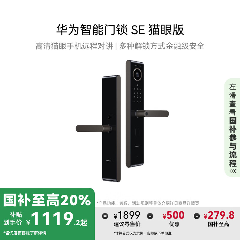 华为智能门锁SE 猫眼版 国补至高20% 高清猫眼手机远程对讲 可充电锂电池 支持天地钩 NFC电子锁价格:1399.00元!