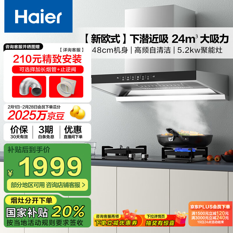 3、家里之前的旧油烟机就是海尔的,一直很信赖这个品牌,换新就又选择了海尔。和客服说想要顶吸,风压大一些的。就给我推荐了这款新欧式系列下潜近吸。比之前的烟机更美观,也不碰头了。安装的过程稍微有点波折,第二次预约到的安装师傅干活非常细致,赞!