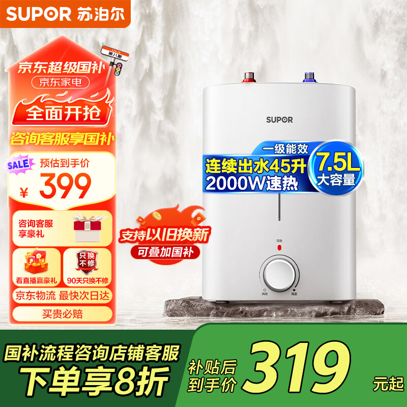苏泊尔(SUPOR)[家电补贴至高20%]一级能效 7.5L电热水器 小厨宝厨房速热式 2000W储水式热水宝 E07-UK17价格:399.00元!