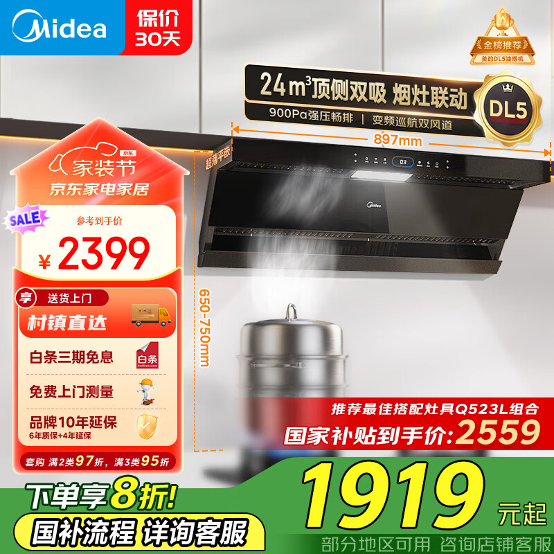 美的(Midea)抽油烟机 家用顶侧双吸烟灶联动 24风量大吸力变频超薄近吸 7字型排油烟机 DL5补贴以旧换新价格:2399.00元!