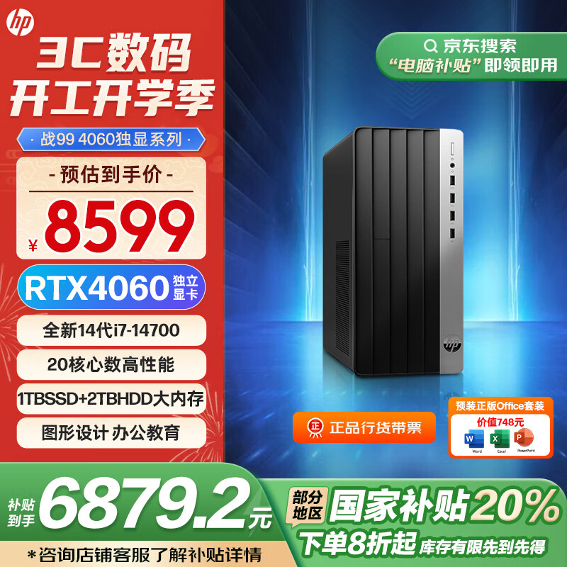 惠普 补贴 战99 游戏台式电脑(i7-14700 32G 1T+2T RTX4060光追)畅玩黑神话 AI训练 DeepSeek部署价格:8599.00元!
