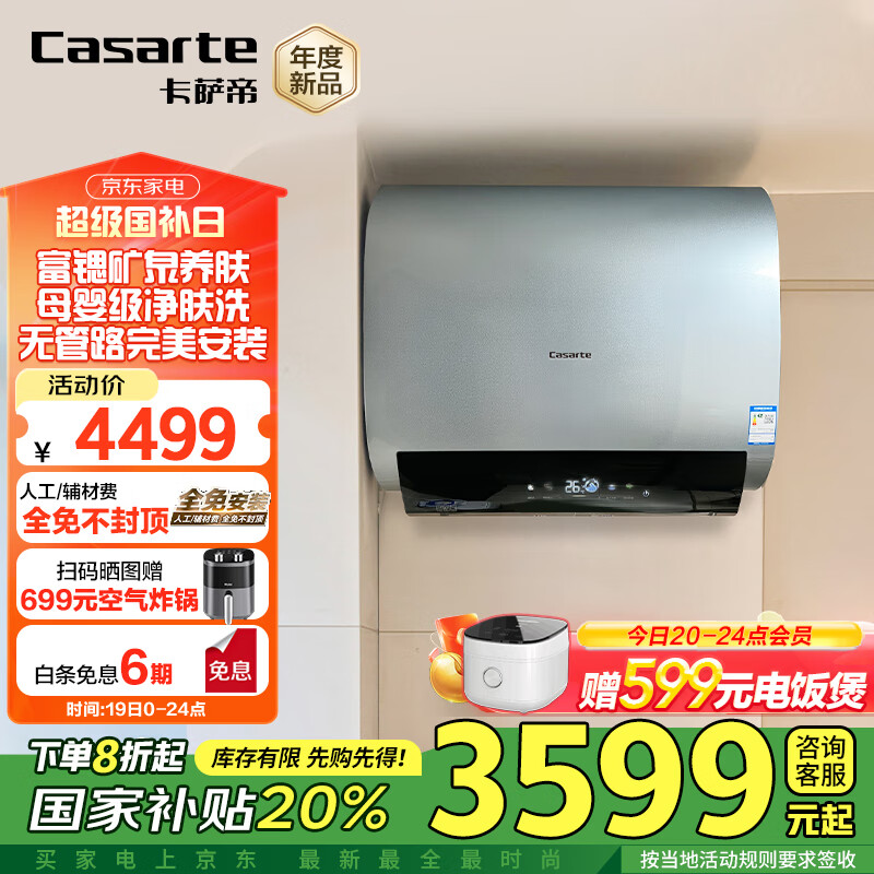 卡萨帝(Casarte)60升【小私汤CJ5PRO】补贴20% 电热水器 双3.3kW速热 小尺寸免清洗双胆扁桶 富锶一级能效价格:4475.00元!
