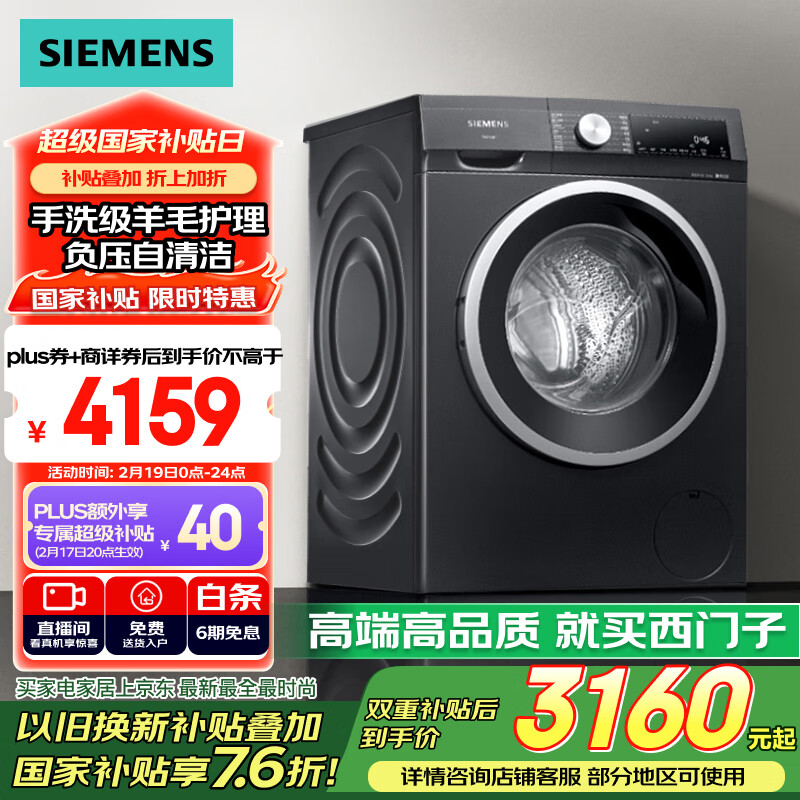 西门子(SIEMENS)iQ300曜石黑系列 10公斤滚筒洗衣机全自动带烘干 洗烘一体 除菌护衣 立体烘干 U24W 家电补贴价格:4399.00元!