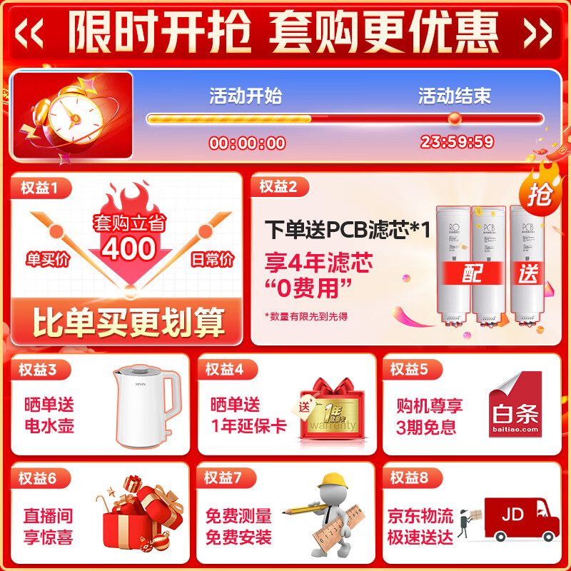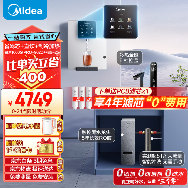 美的(Midea)省芯直饮冷热净水器套装【白泽1000pro+管线机902D+前置25pro】反渗透 家用壁挂式加热一体净饮机价格:4749.00元!