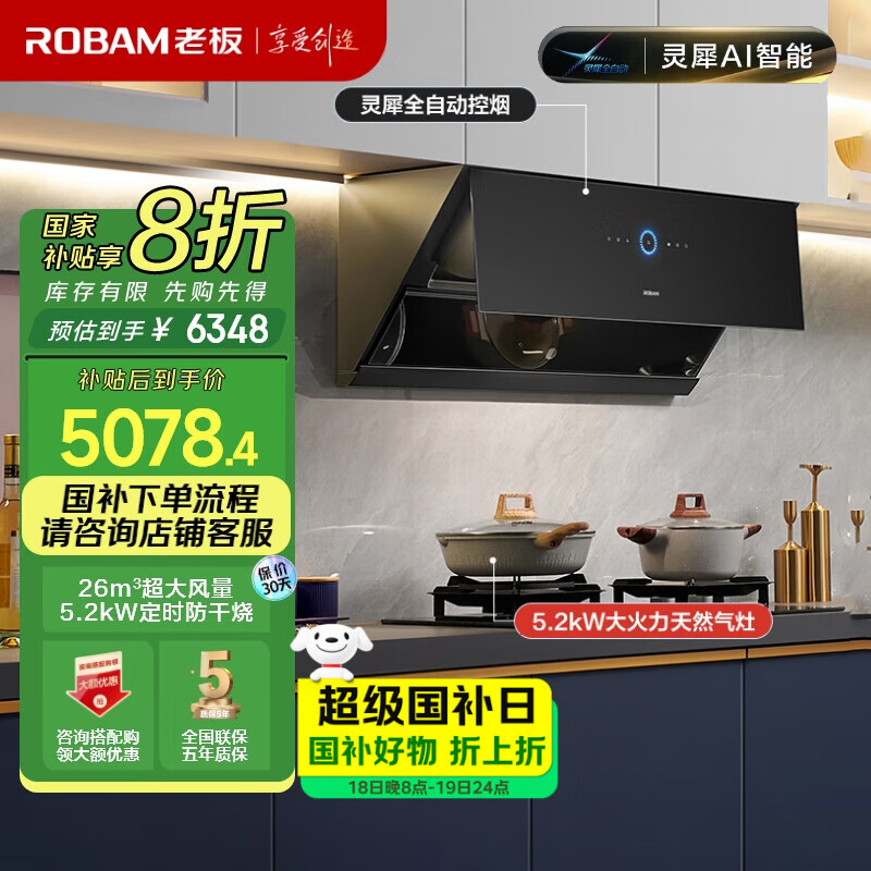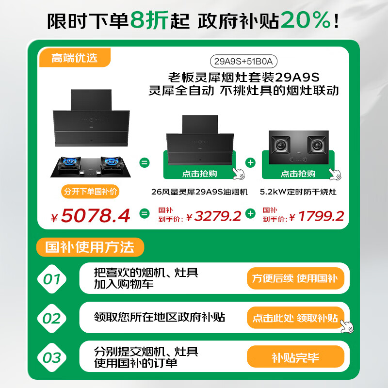 老板(Robam)灵犀联动26风量侧吸抽油烟机家用大吸力定时防干烧燃气灶具29A9S+51B0A烟灶套装(天然气)价格:6348.00元!