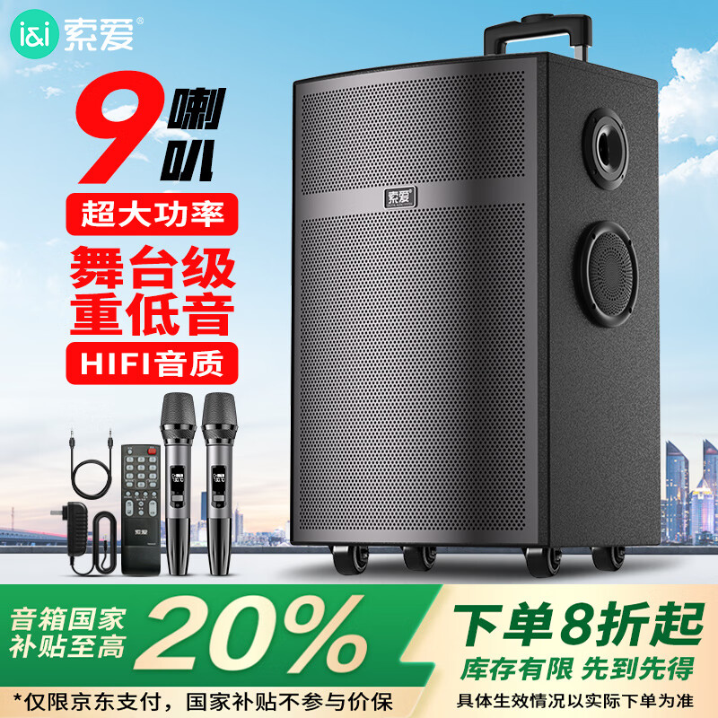 索爱(soaiy)SA-F95升级4个轮大功率9喇叭重低音广场舞家用户外k歌电木吉他乐器音箱蓝牙拉杆便携音箱话筒8吋价格:899.00元!