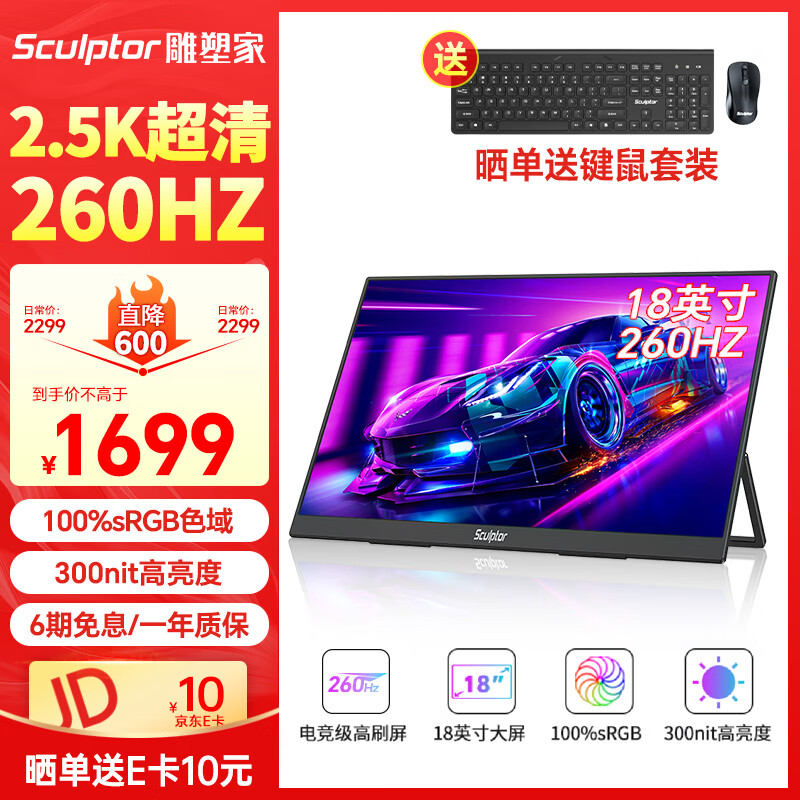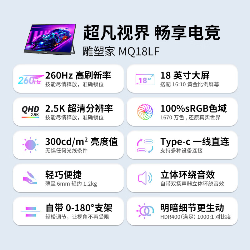 雕塑家18英寸便携式显示器2.5k 260Hz高刷100%sRGB色域 Ps4/5游戏电竞扩展屏笔记本电脑一线直连MQ18LF价格:2299.00元!