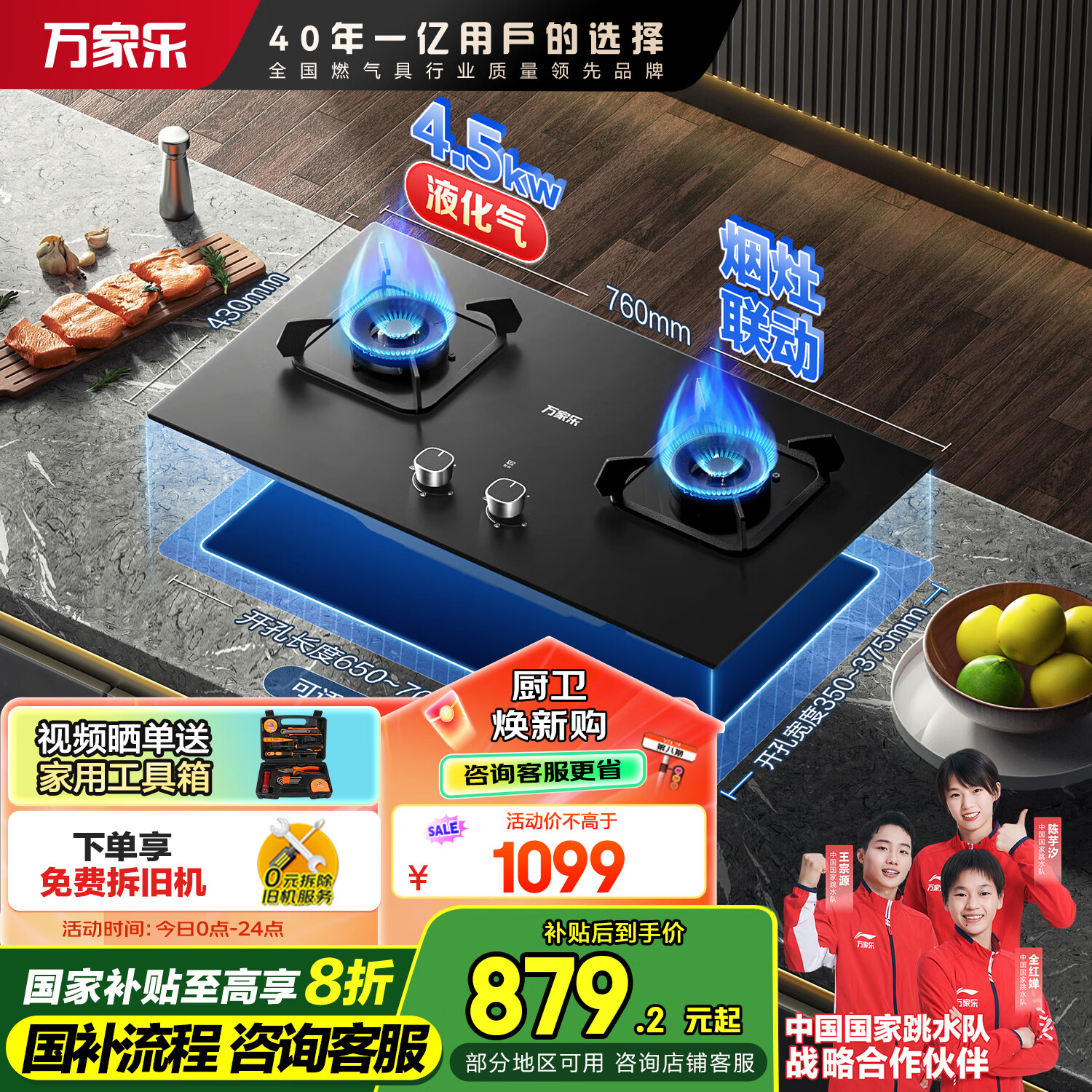 万家乐燃气灶4.5kw大火力 家用嵌入式燃气灶具【家电补贴20%】烟灶联动 全进风JZY-KV063B液化气灶价格:1099.00元!