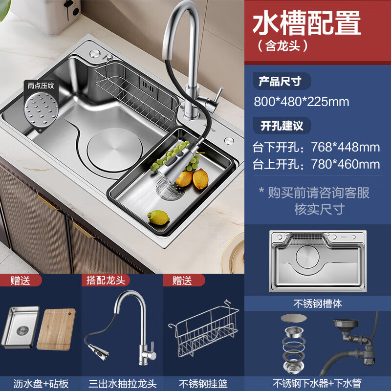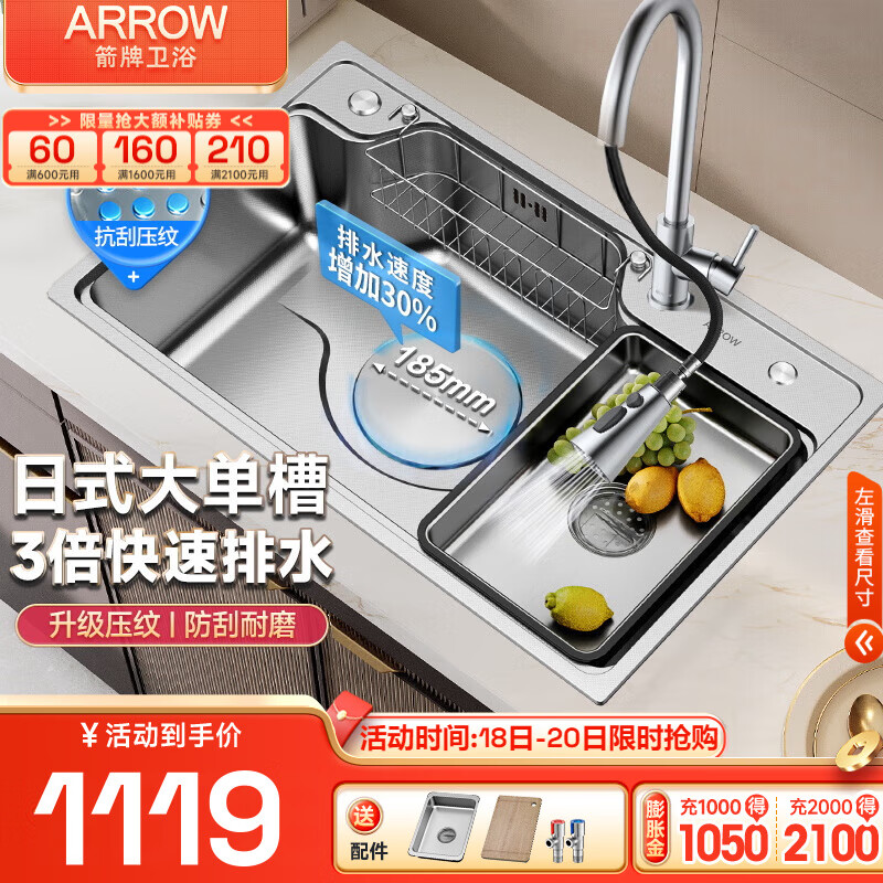 箭牌(ARROW)304不锈钢水槽 日式大口径单槽厨房洗菜盆台上盆大单槽 80*48压纹大口径+冷热抽拉龙头价格:1319.00元!