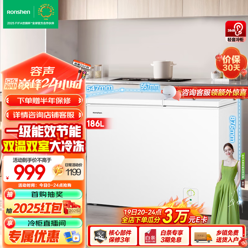 容声(Ronshen)186升冷柜减霜双室双温家用冰柜冷冻冷藏两用顶开门一级能效大冻力囤货冰箱BCD-186ZMSM以旧换新价格:1099.00元!