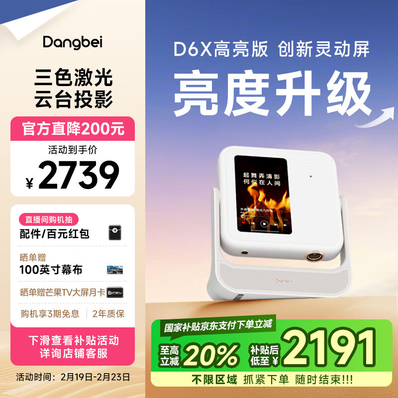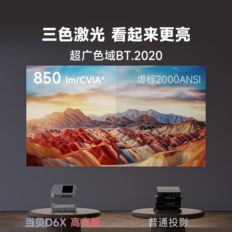 当贝D6X高亮版 三色激光投影仪家用 轻薄便携云台 AI智能屏高清家庭影院可投天花板(亮度升级 3+32G)价格:2739.00元!