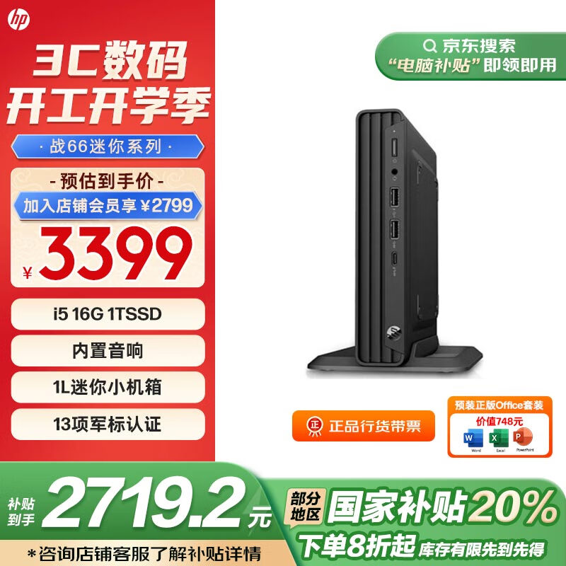 惠普(HP)补贴 战66 台式电脑Mini迷你主机(13代i5 16G 1T SSD)办公学习机 内置音响 带键鼠价格:3399.00元!