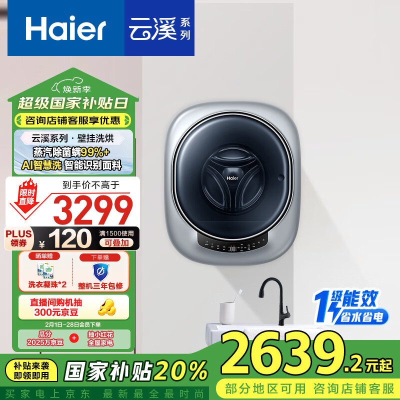 海尔(Haier)壁挂洗衣机小型全自动 内衣婴儿洗衣机家用洗烘一体 3KG除菌 家电补贴20% 一级能效云溪716U1价格:3299.00元!