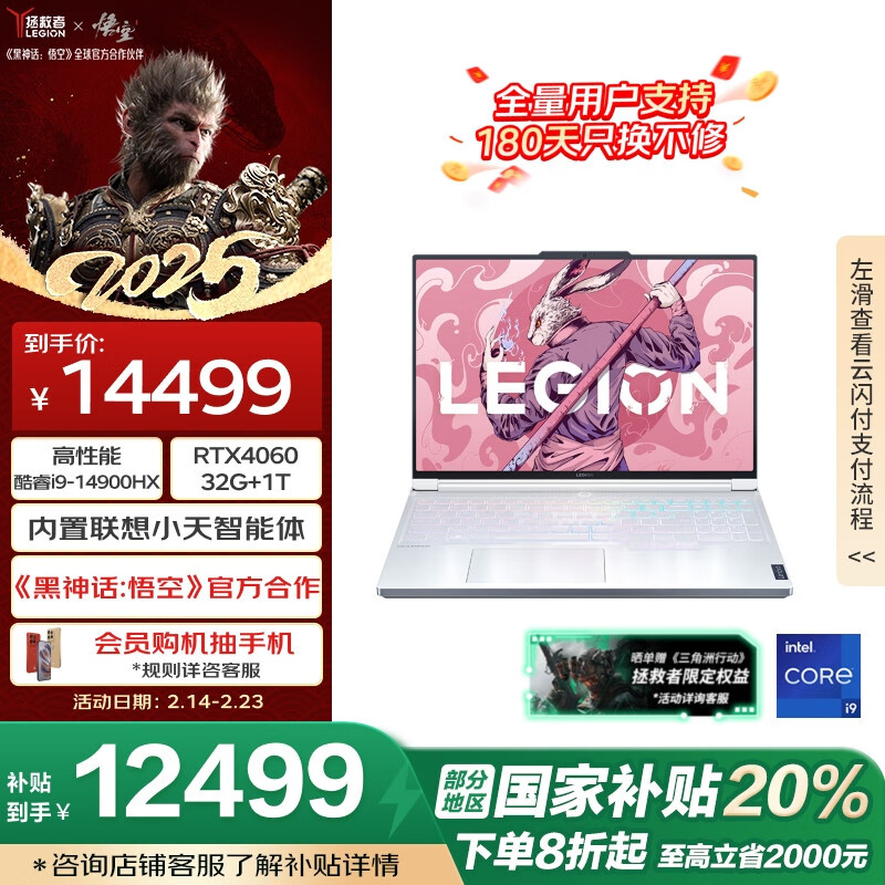 联想拯救者Y9000X AI元启 电竞游戏笔记本电脑 i9-14900HX 32G 1T RTX4060 3.2K屏 /政府补贴20%价格:14499.00元!