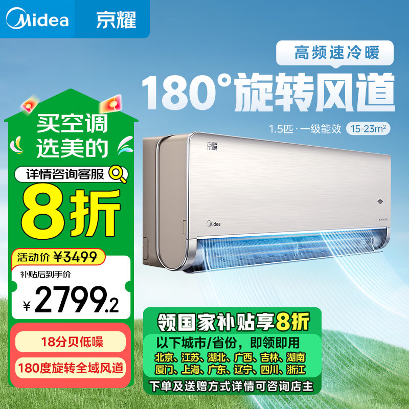 美的(Midea)1.5匹京耀 变频冷暖防直吹 新一级变频壁挂式空调挂机180°全域风道 KFR-35GW/N8MXJ1价格:3499.00元!