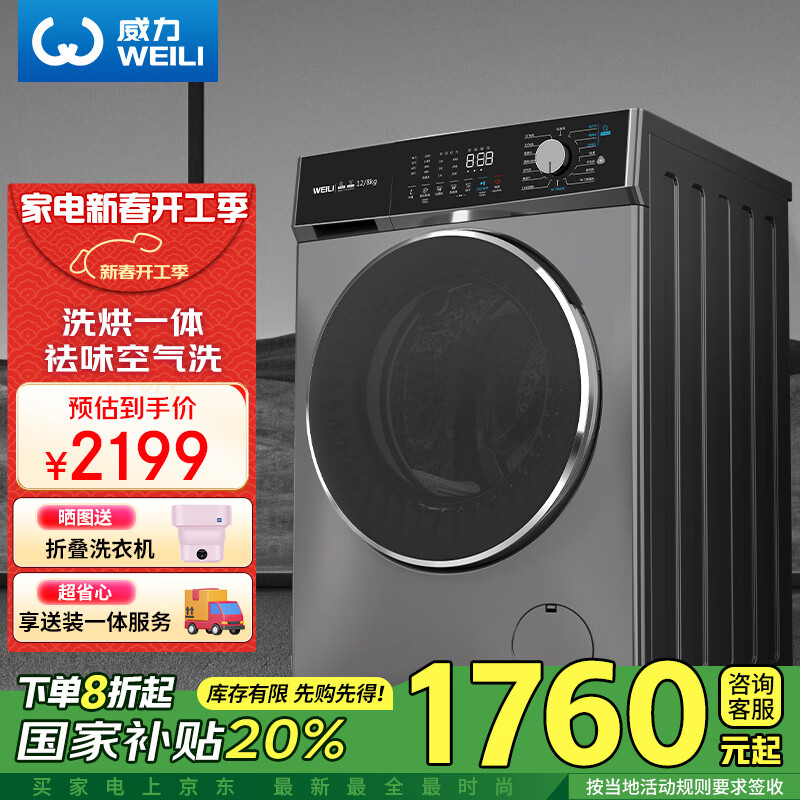 威力(WEILI)滚筒洗衣机 12KG变频大容量洗烘一体 祛味空气洗蒸汽除菌 BLDC节能电机 XQG120-1428DPHX送装一体价格:2199.00元!
